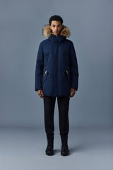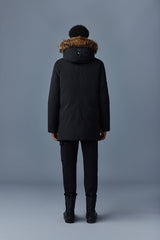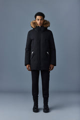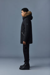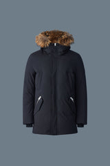 Stay warm in style with the Mackage Edward 2-in-1 down parka for men. Made with recycled down and a removable hooded bib, this parka is engineered to keep you warm in the coldest temperatures. Its windproof and water resistant design, along with insulated pockets and a hidden waist drawcord, make it the perfect winter essential. Plus, the contrasting leather detailing and sleeve logo patch add a touch of timeless style.