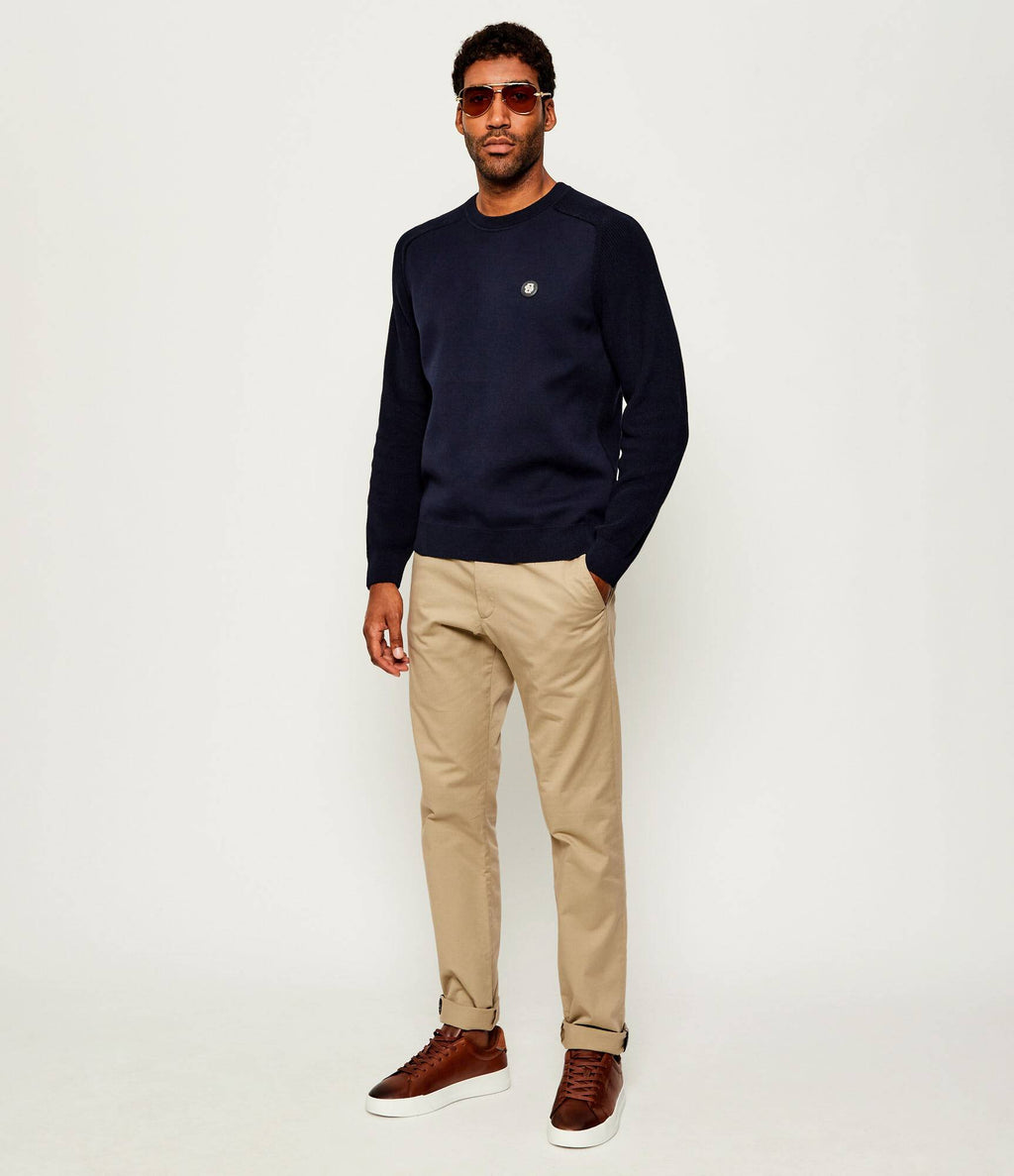 This model stands 188 cm tall and sports a size L. Made entirely from 100% cotton, this navy blue sweater is part of the Fall/Winter 2025 collection. It features a Regular Fit for easy comfort and style. Find it under BOSS BLACK line.