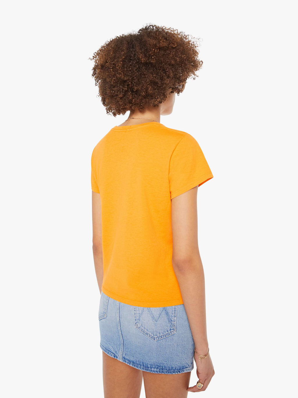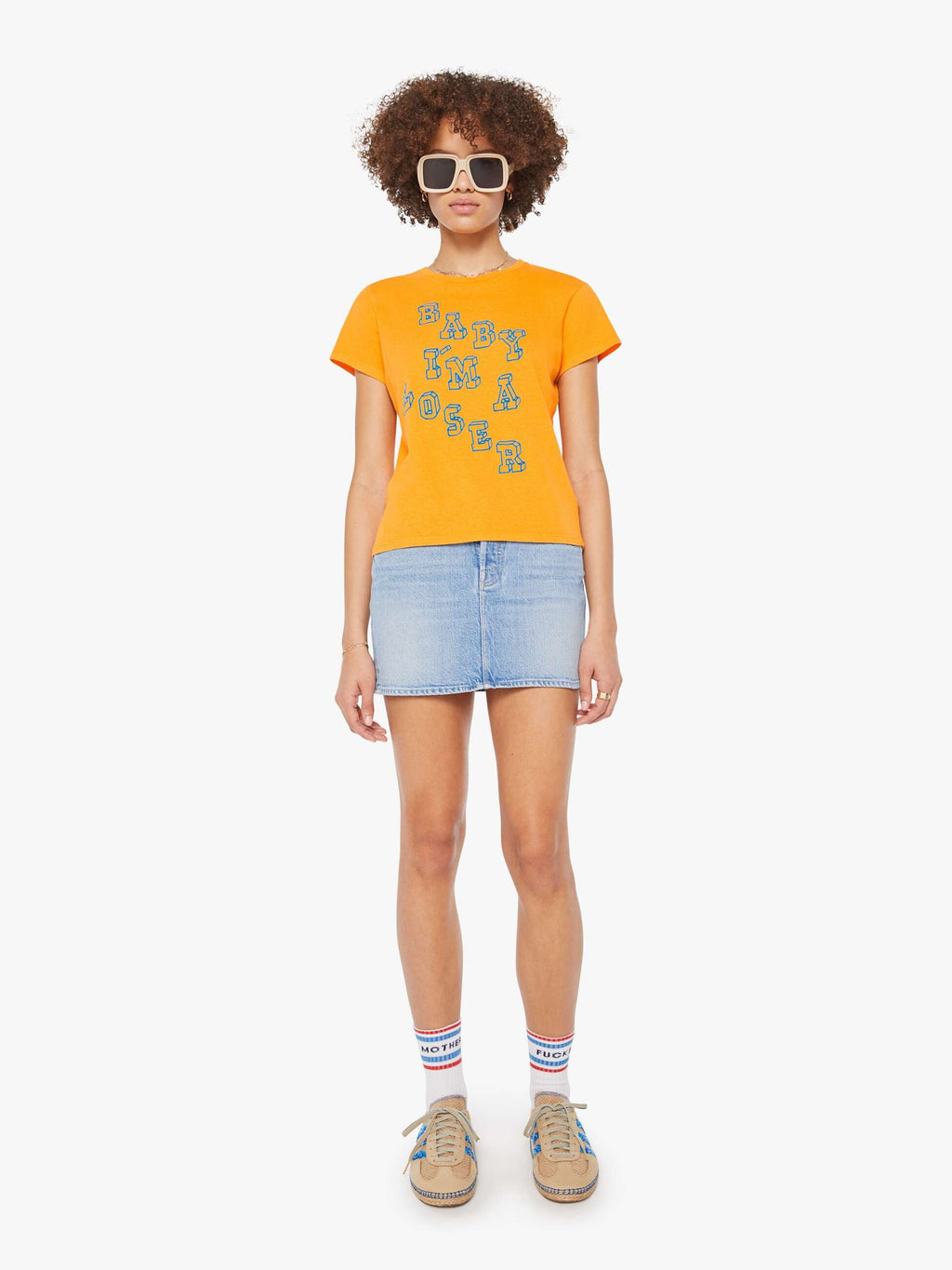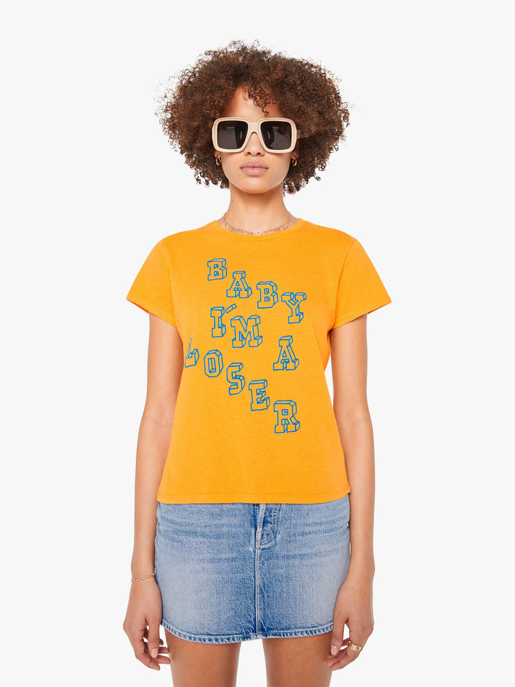 Fair warning: The Lil Goodie Goodie from Baby I'm A Loser is a cozy, gently sheer crewneck with a slim, vintage-inspired fit. Crafted from 100% cotton, this vibrant orange tee shows off bold blue block lettering on the front. Proudly made in Los Angeles with carefully selected imported fabrics.