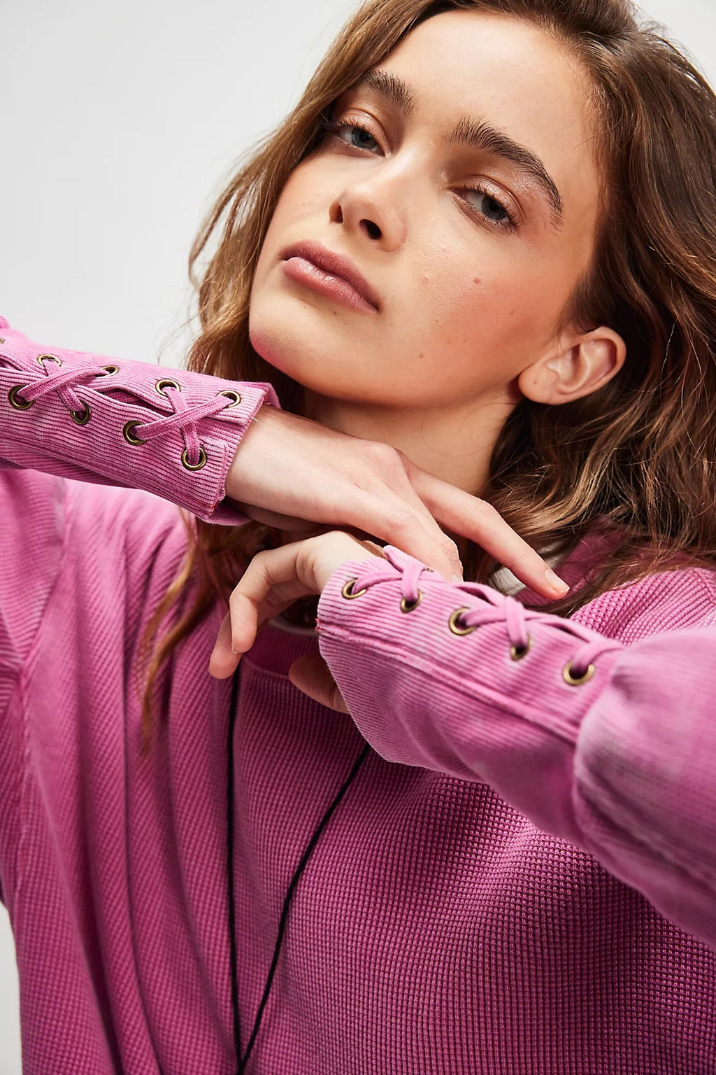 Cozy up in this playful pink sweater from We The Free, featuring charming lace-up cuffs and a relaxed long sleeve design. Made from classic thermal fabric with fun, puffed sleeves that add a flirty twist. Crafted from 100% cotton and easy to care for with a cold machine wash.