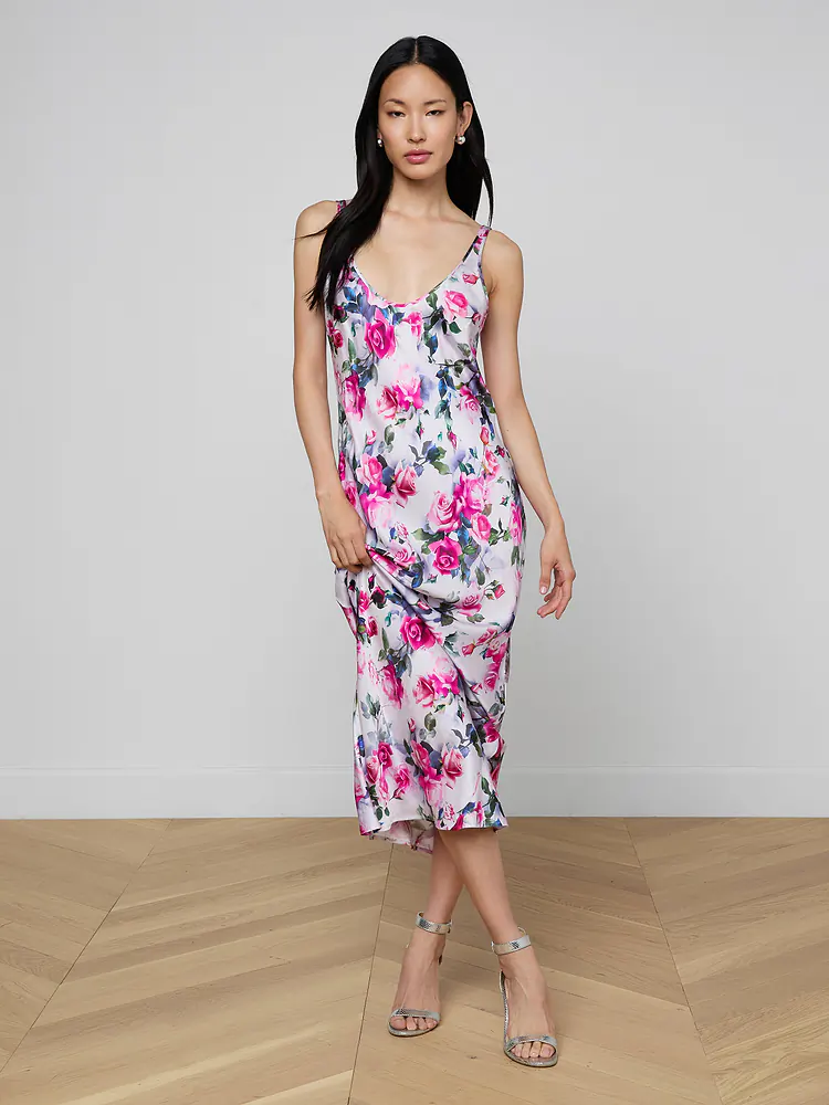 Romantic and elegant, the Akiya dress captures effortless sophistication with its bias-cut glossy satin that drapes beautifully over your silhouette. This beloved bestseller returns in a stunning pink rose print, perfect for both day and evening wear. The fluid, flattering design requires no closure for a seamless look. A timeless piece that transitions seamlessly from casual to refined occasions.