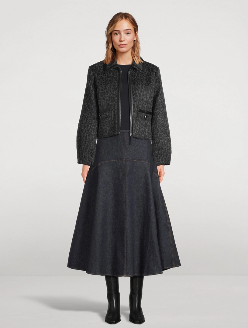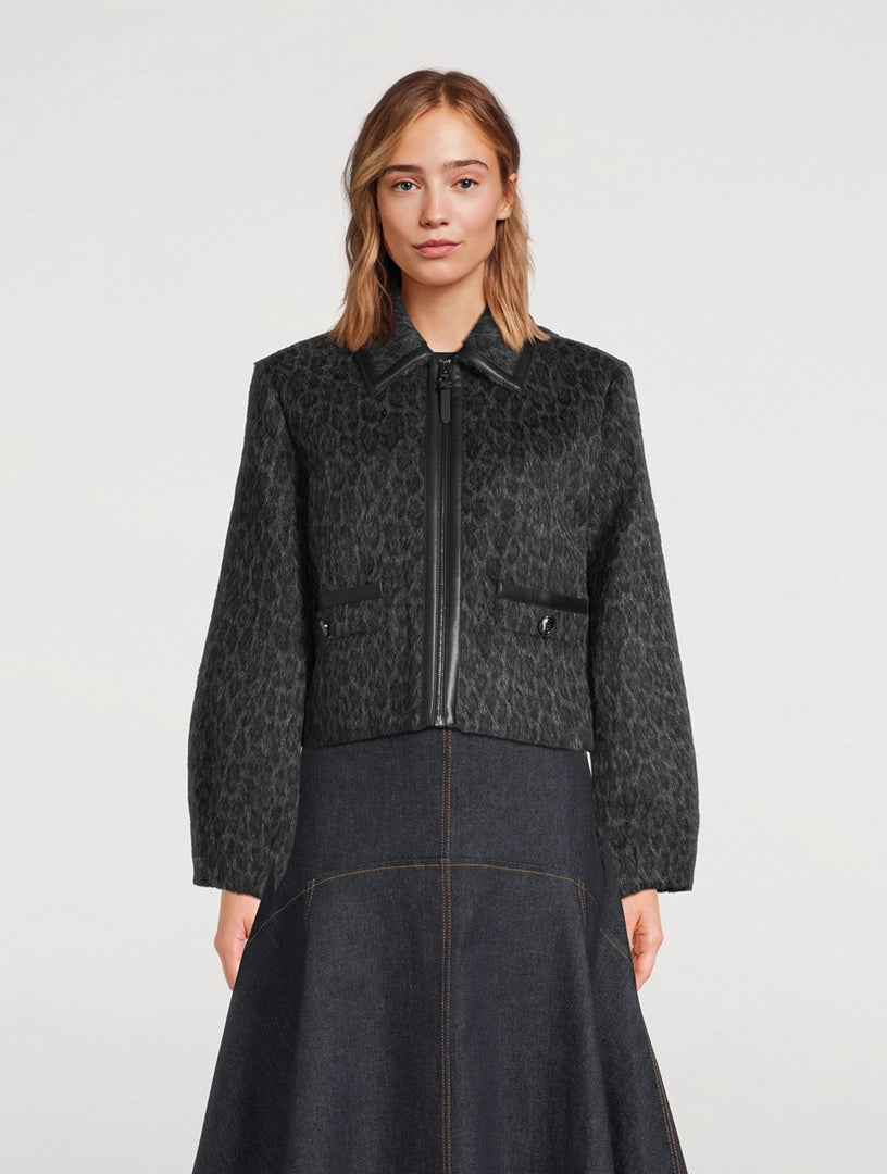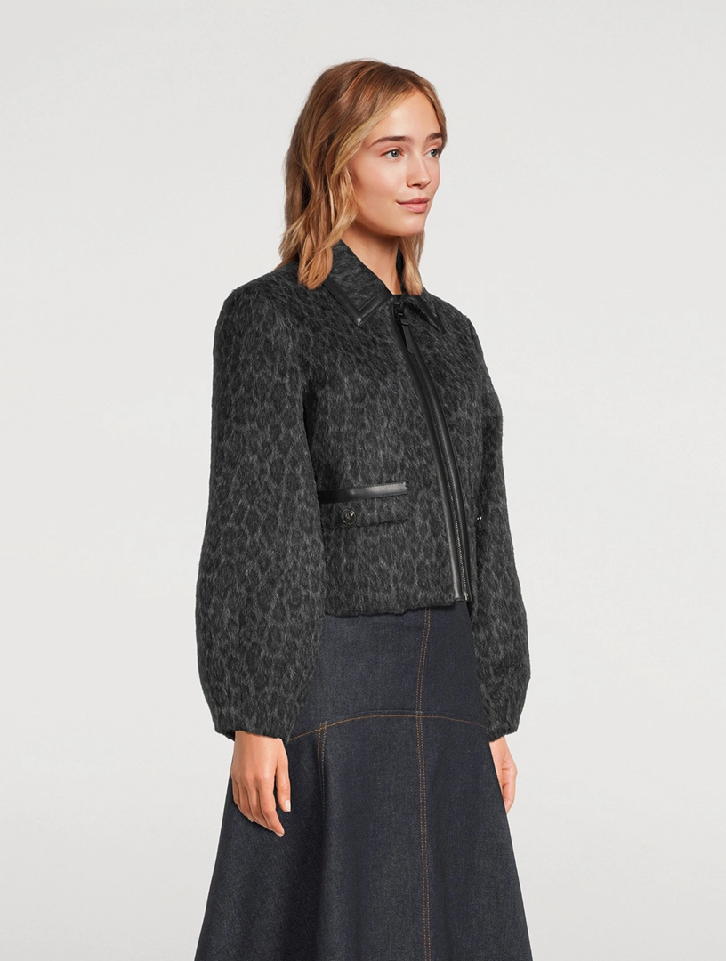 Lorah is a fun, cropped jacket featuring an eye-catching animal jacquard print. Made from a cozy mix of alpaca wool, it plays up the style with balloon sleeves and a classic shirt collar. Leather-trimmed welt pockets and signature “M” shank buttons add a chic touch. Crafted with care from quality materials, this jacket fits true to size and brings a bold, playful twist to your wardrobe.
