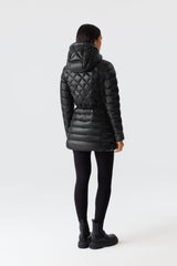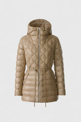 Stay cozy and stylish in the Mackage TOOKY Diamond Quilted Light Down Jacket. Crafted from recycled nylon with a shiny finish, its diamond quilting and storm visor hood bring playful charm to chilly days. Filled with eco-friendly recycled down, it keeps you warm without the bulk. With smart features like underarm vents, an adjustable waist, and secure zippered pockets, this jacket is ready for whatever cool adventures come your way.