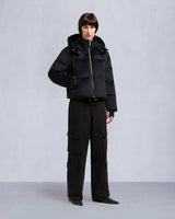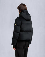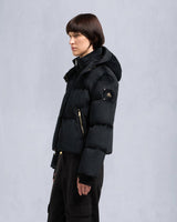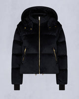 Indulge in the ultimate luxury with our Moose Knuckles Womens Velour Misti Gold Puffer in Black. This unique velour jacket from our Gold Series adds a touch of opulence to any outfit. With its modern, cropped style, this puffer jacket offers both comfort and style, making it a must-have for every wardrobe.