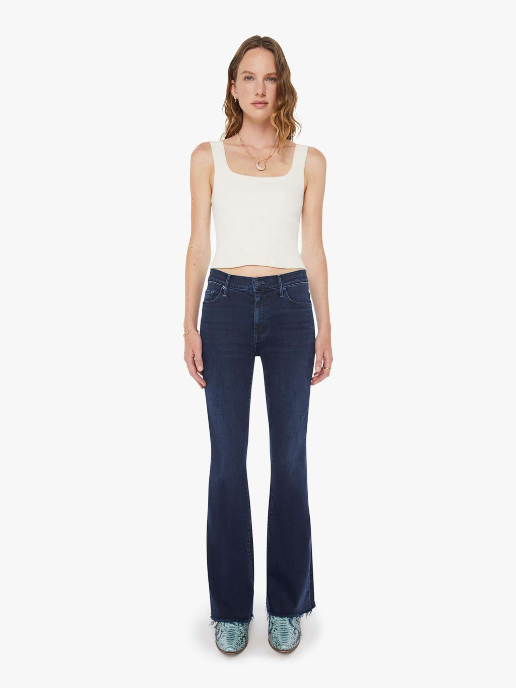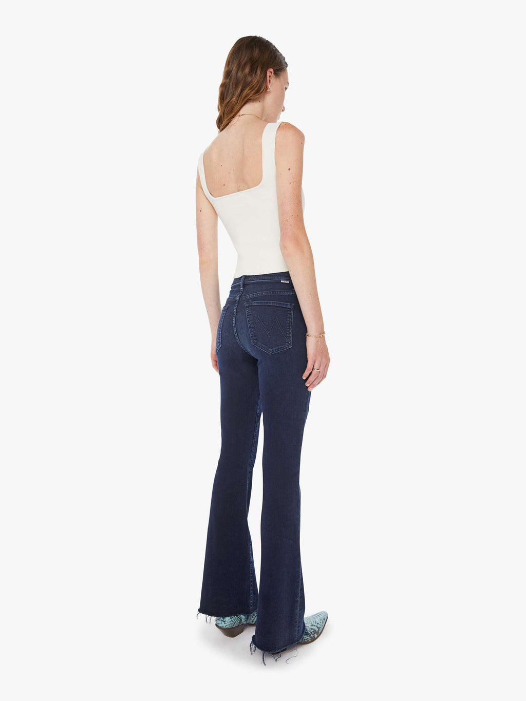 Shake off the negativity in Mother's Weekender Fray, our go-to mid-rise flare that refuses to take life too seriously. Featuring a 31-inch inseam with an intentionally frayed hem, this dark blue denim whispers understated cool with barely-there fading and whiskering details. Crafted from stretch denim with just the right amount of give, it moves with you all day long. Proudly made in Los Angeles using premium imported materials, because good vibes deserve quality construction.