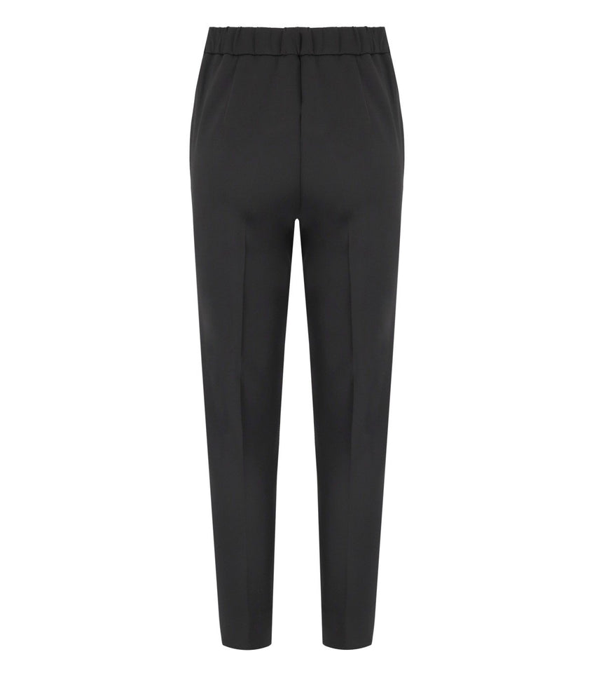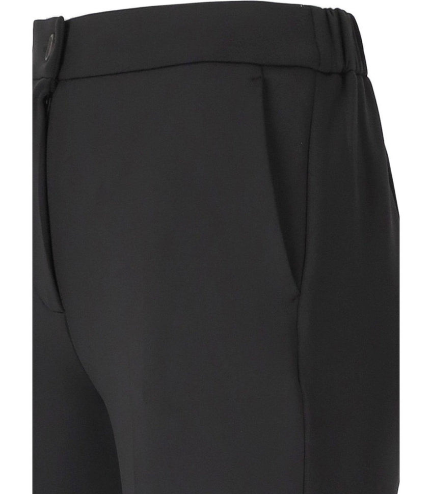 Step out in style with the MM Max Mara Gerona Pants, crafted from sleek scuba fabric in classic black tones. These slim-fit cigarette trousers feature a sharp pressed crease and handy French pockets for a touch of chic practicality. With an elasticated waistband at the back and a small rounded slit at the hem, they combine comfort with playful details. Finished with a zip and hook closure, these pants are perfect for mixing with your favorite tops for a effortlessly cool look. Made from a stretchy blend of polyester and elastane, they move with you all day long.