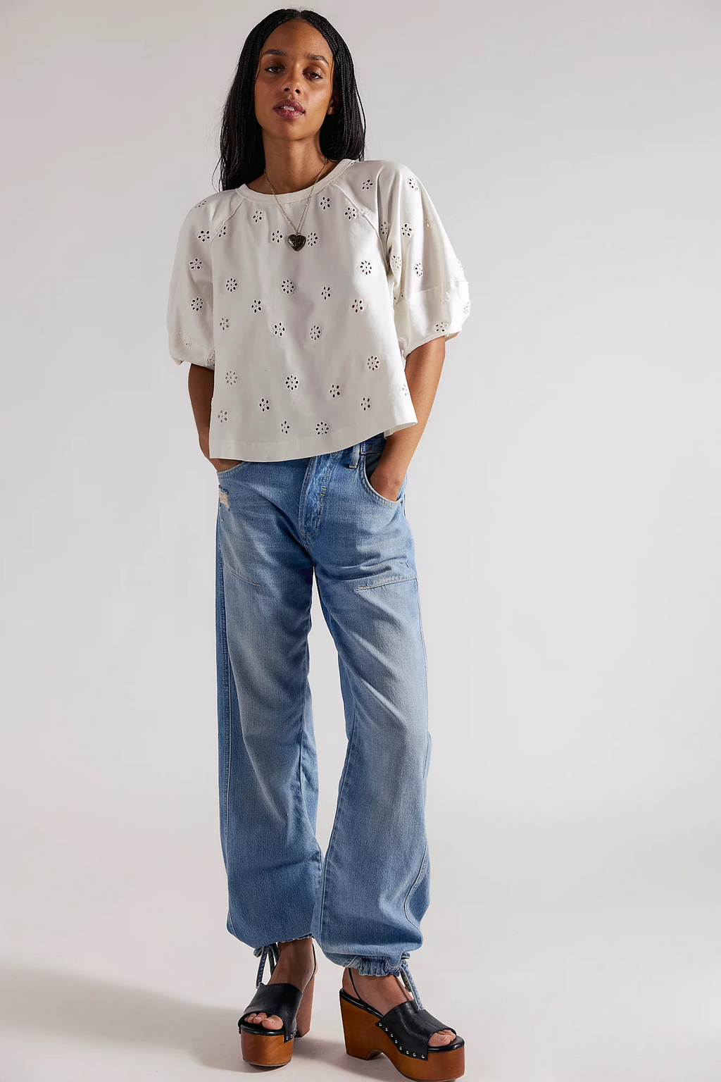 Capture carefree style with the Free People Jessie Eyelet Tee. This cropped, boxy tee features playful puff sleeves and delicate eyelet detailing that adds texture and visual interest. The soft cotton-blend fabric keeps things light and breathable, while the rounded neckline and raglan short sleeves create an effortlessly relaxed vibe. Perfect for layering or wearing solo, it's your go-to piece for laid-back days with personality.