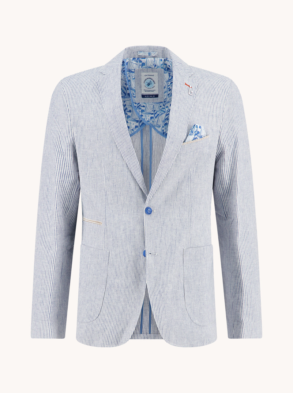 Elevate your summer wardrobe with this lightweight blazer from A Fish Named Fred, featuring a subtle vertical stripe and breathable linen-inspired fabric. The regular fit keeps you cool without sacrificing style, while signature playful lining, an iconic fish hook lapel detail, and matching pocket square add personality to every wear. Perfect for weddings, rooftop gatherings, or elevated casual office days a versatile piece that brings fresh sophistication to warm-weather dressing.