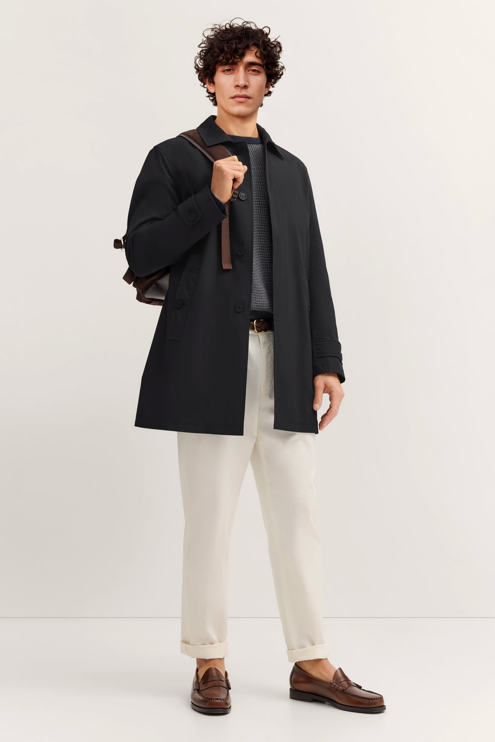 This Bugatti men's coat delivers refined simplicity for versatile everyday wear. Constructed from a premium cotton blend (67% cotton, 29% polyester, 4% elastane) with Coolmax finish, it offers water-repellent protection while remaining breathable and PFC-free. The regular fit, turn-down collar, and concealed button placket create an understated aesthetic suited to both casual and business settings. Slanted welt pockets with button closures and a full interior lining with practical pockets enhance functionality without compromising the clean silhouette.