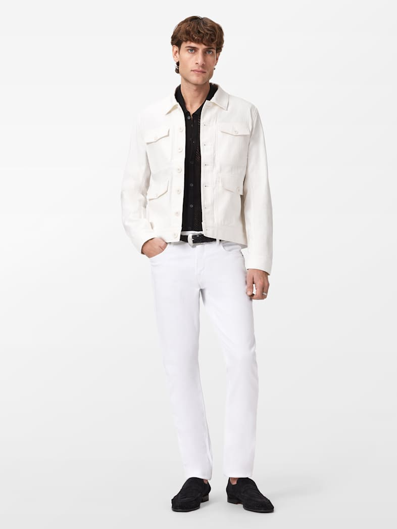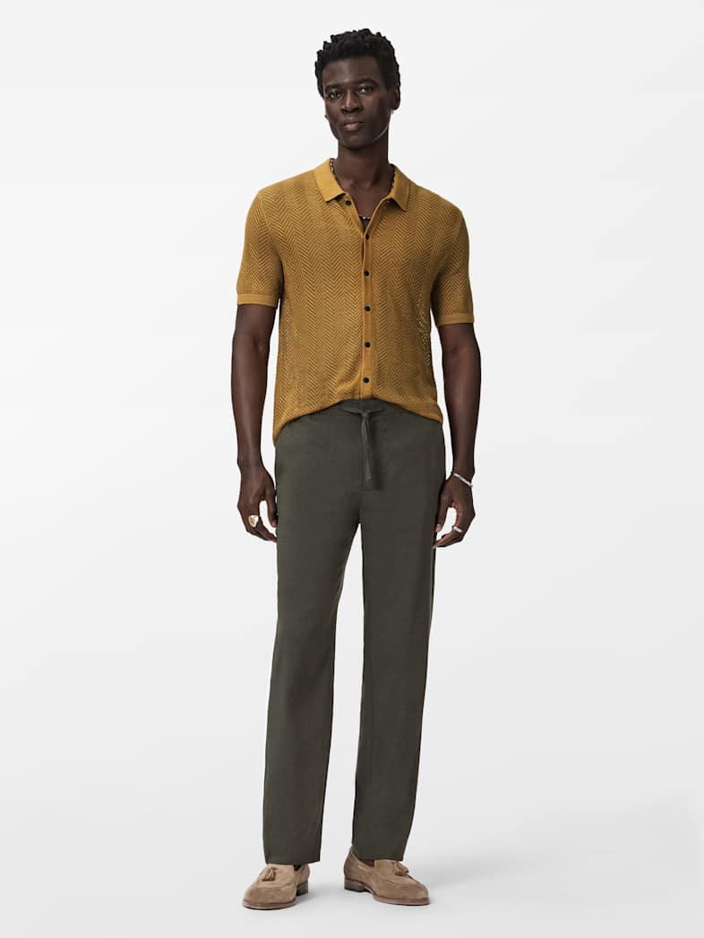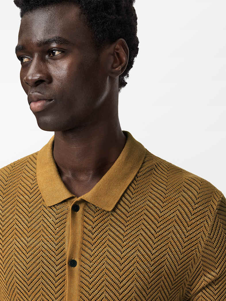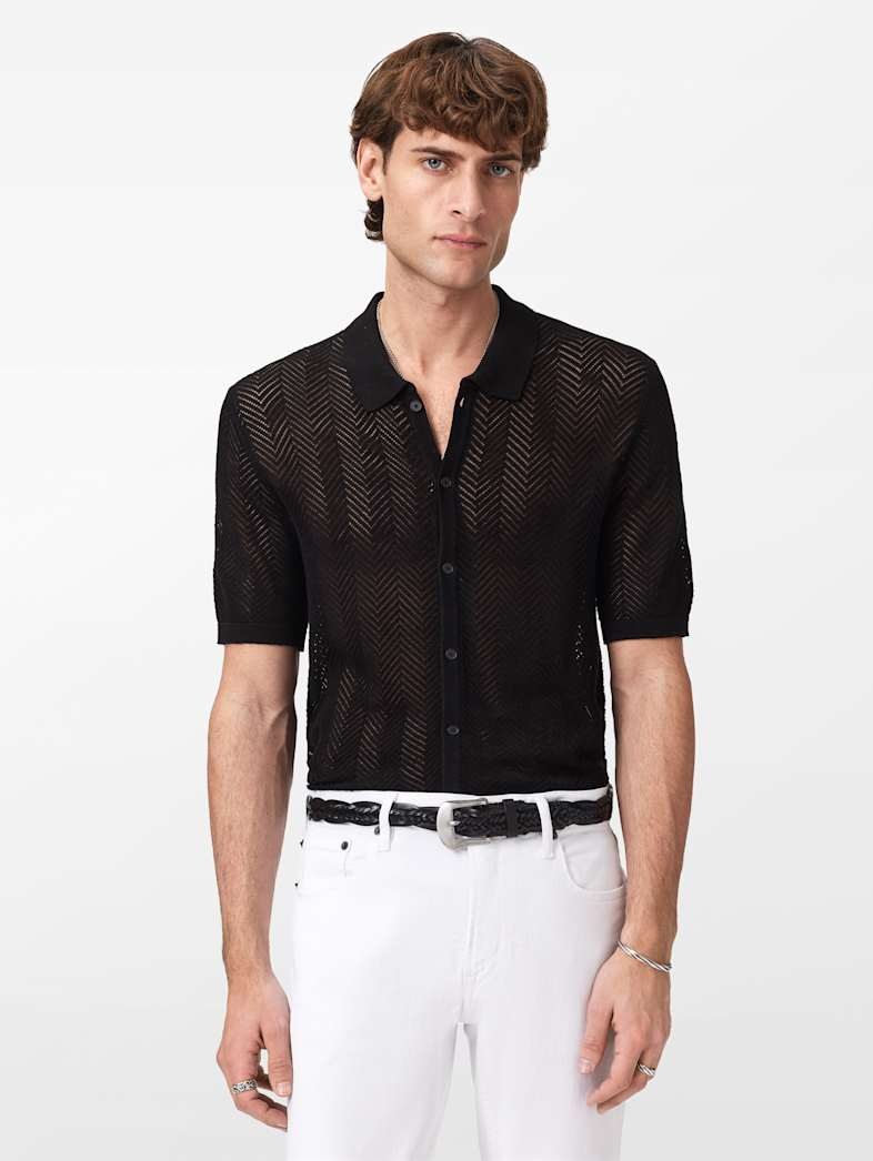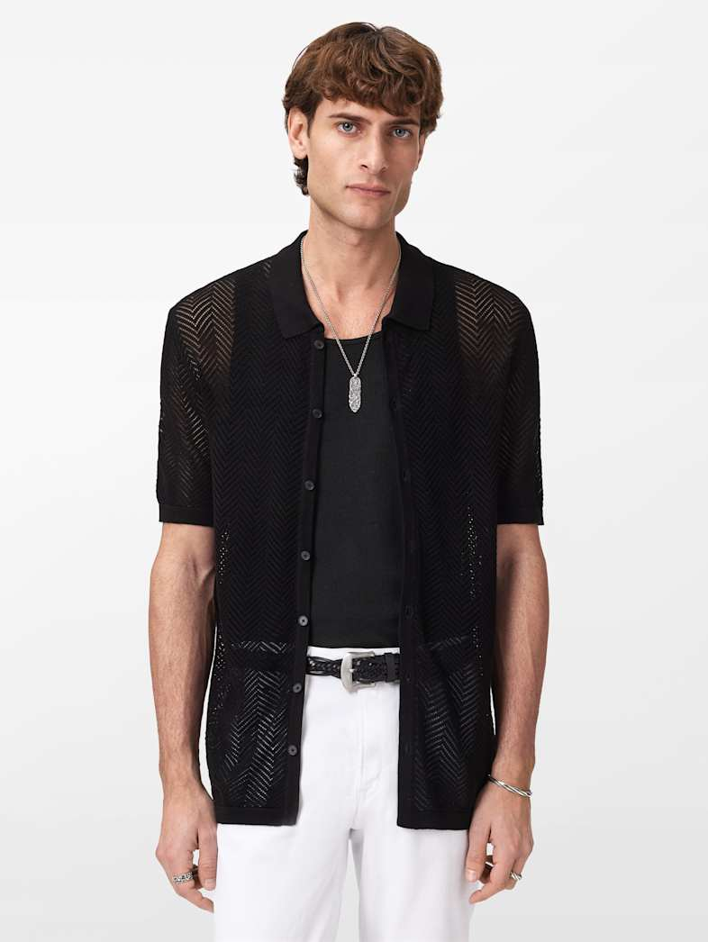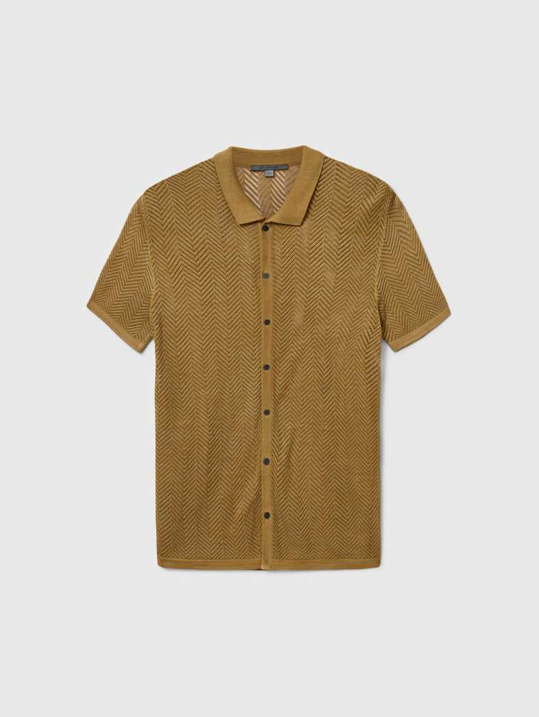 Herringbone pointelle stitch adds texture and subtle sheen Angled back shoulder seams for a tailored feel Short-sleeve, relaxed silhouette for versatile wear Metal logo buttons and flag label for signature detailing Crafted from an organic cotton and viscose blend, the Ginsberg Shirt elevates a classic short-sleeve silhouette with understated refinement. The herringbone pointelle weave creates visual depth while maintaining a soft hand, while angled back shoulder seams ensure a tailored fit that moves with you. Metal logo buttons and a flag label complete the design with signature detailing.