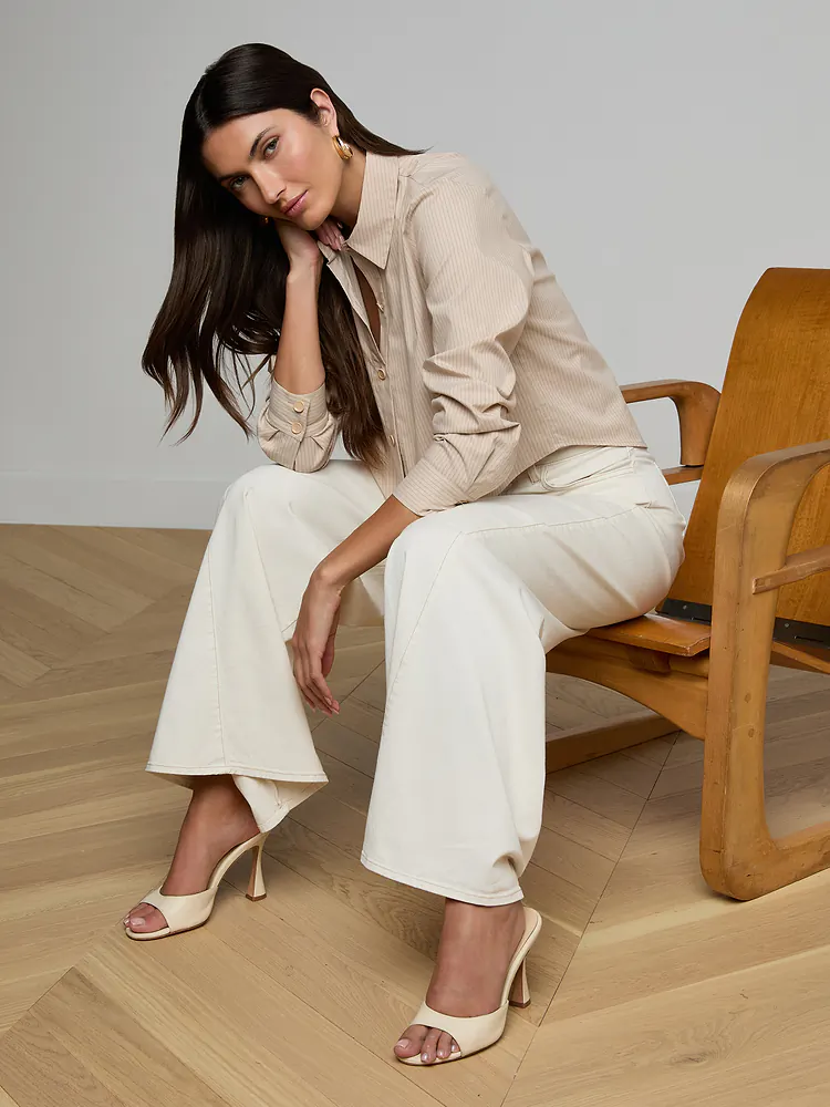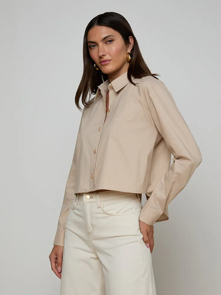 Effortless menswear-inspired elegance meets modern minimalism in this L'Agence classic. The cropped silhouette features a subtly asymmetrical hem and soft organic cotton blend in warm beige with delicate stripes. Button-front closure and relaxed tailoring make it endlessly versatile—layer over basics or wear solo for understated sophistication. A wardrobe essential that bridges casual and refined.