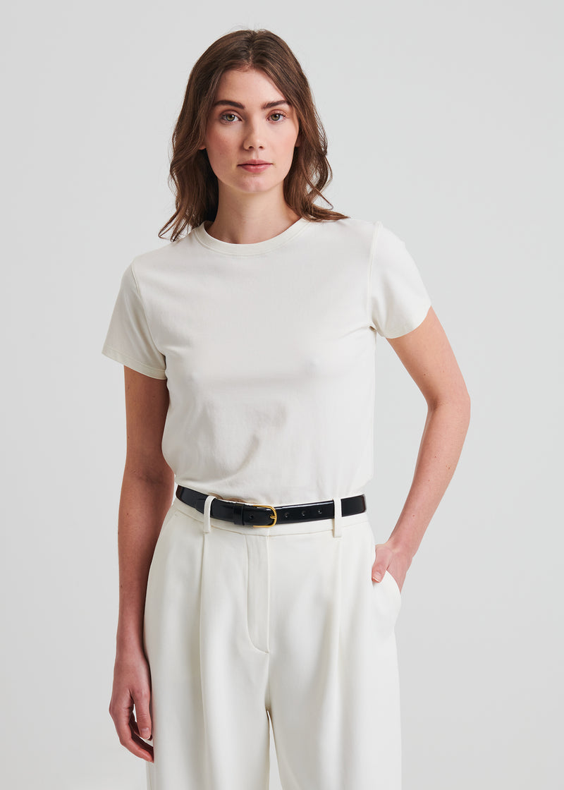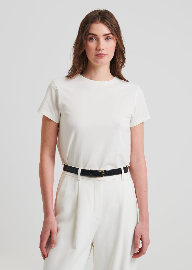 Crafted from premium Peruvian Pima cotton blended with spandex, this slim-fit tee delivers exceptional softness and stretch. The lightweight jersey drapes beautifully and moves with you, making it perfect as a layering piece under jackets or worn solo. True-to-size fit with a flattering silhouette. Machine wash cold, tumble dry. Made in Peru.