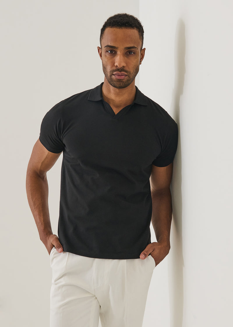 Experience understated elegance with this premium Pima cotton polo. Crafted from 95% luxurious Peruvian Pima cotton blended with 5% spandex, it delivers exceptional softness and subtle stretch for all-day comfort. The refined open collar design pairs effortlessly with both casual and polished looks, while the slim fit creates a modern silhouette. True-to-size and made in Peru, this is a versatile investment piece for those who value quality craftsmanship and timeless style.