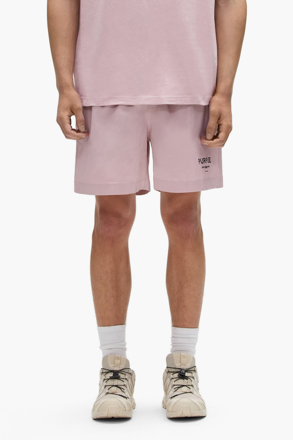 The Purple Brand Showrooms All Around Short combines contemporary style with practical design for spring-summer 2026. Constructed from 100% polyester with a water-repellent treatment, this regular-fit short offers durability and weather resistance. Features include an elastic waistband with flat drawcord for adjustable comfort, woven polyester construction, and a striking silicone print detail. The clean white label aesthetic pairs effortlessly with any wardrobe. Authentic Purple Brand quality is guaranteed with every signature hang tag included.